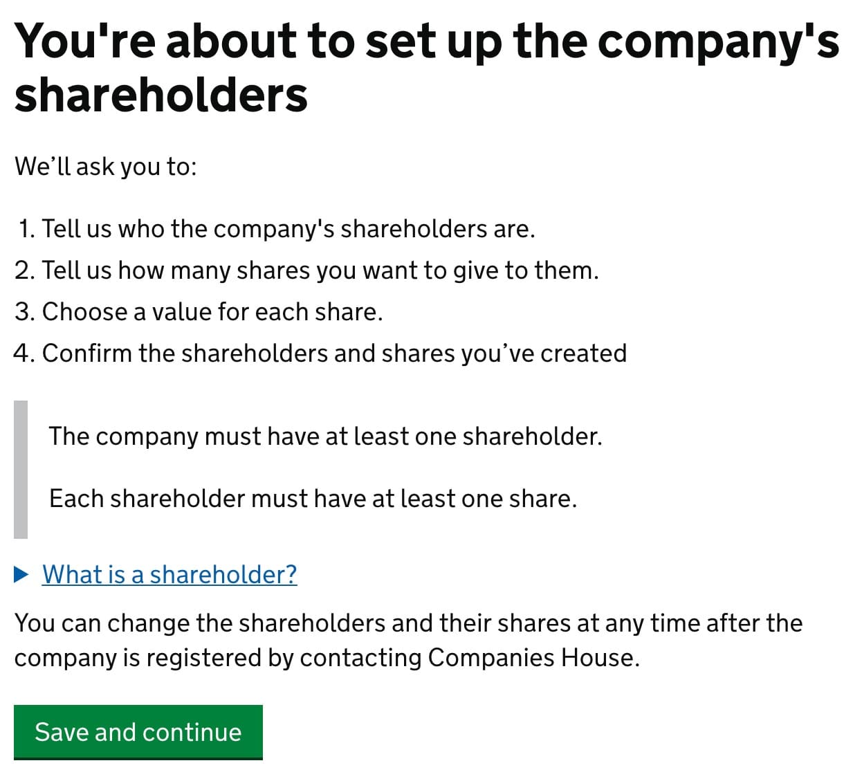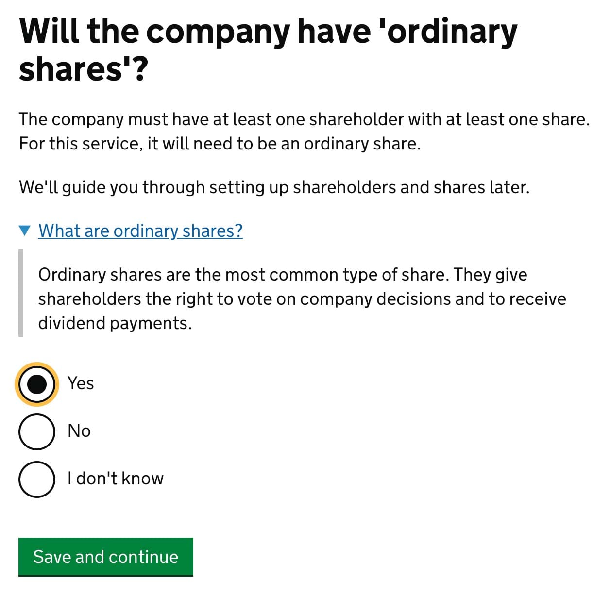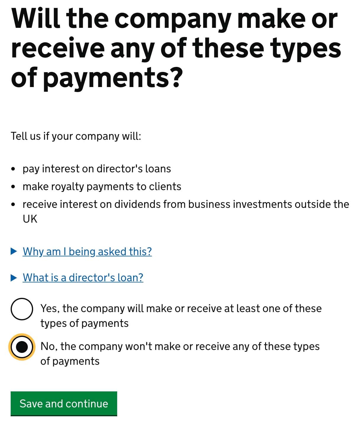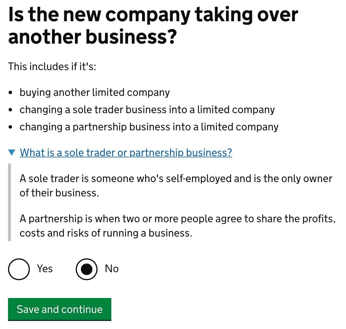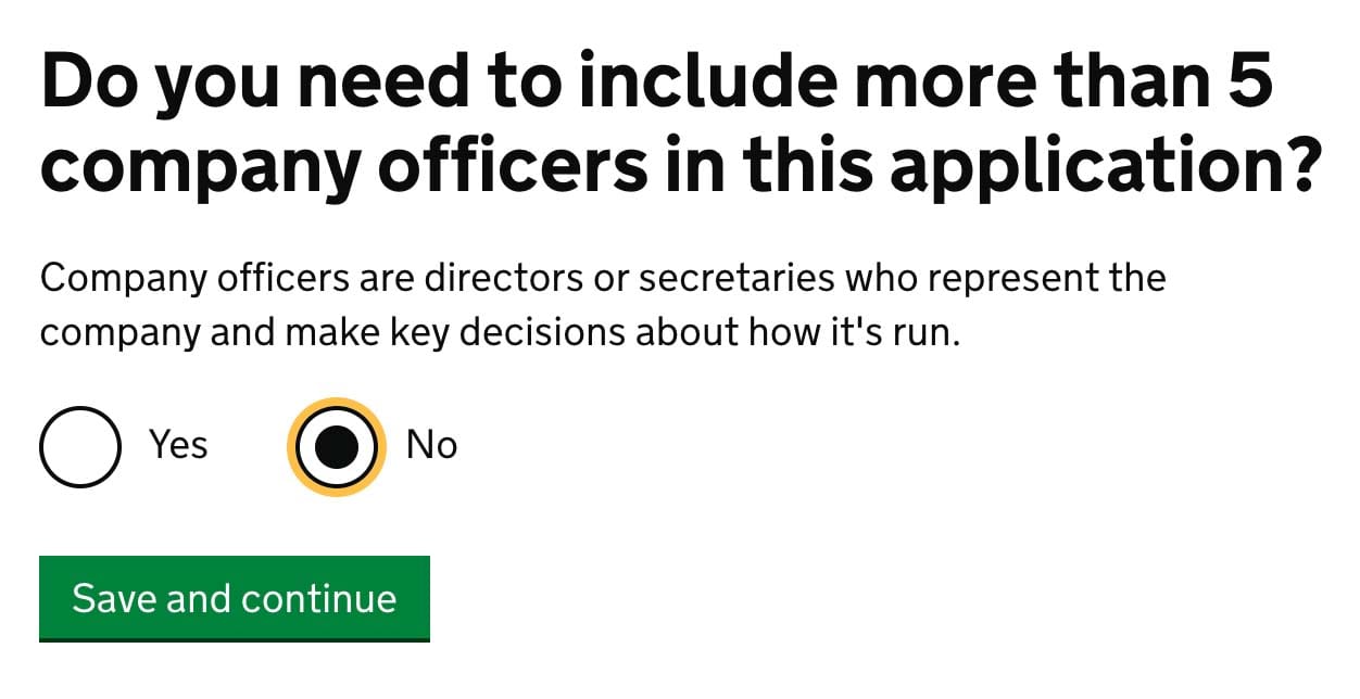 I impose, you are creating a one person company or at least one, that have less than five members (officers). Choose No and click Save and continue.