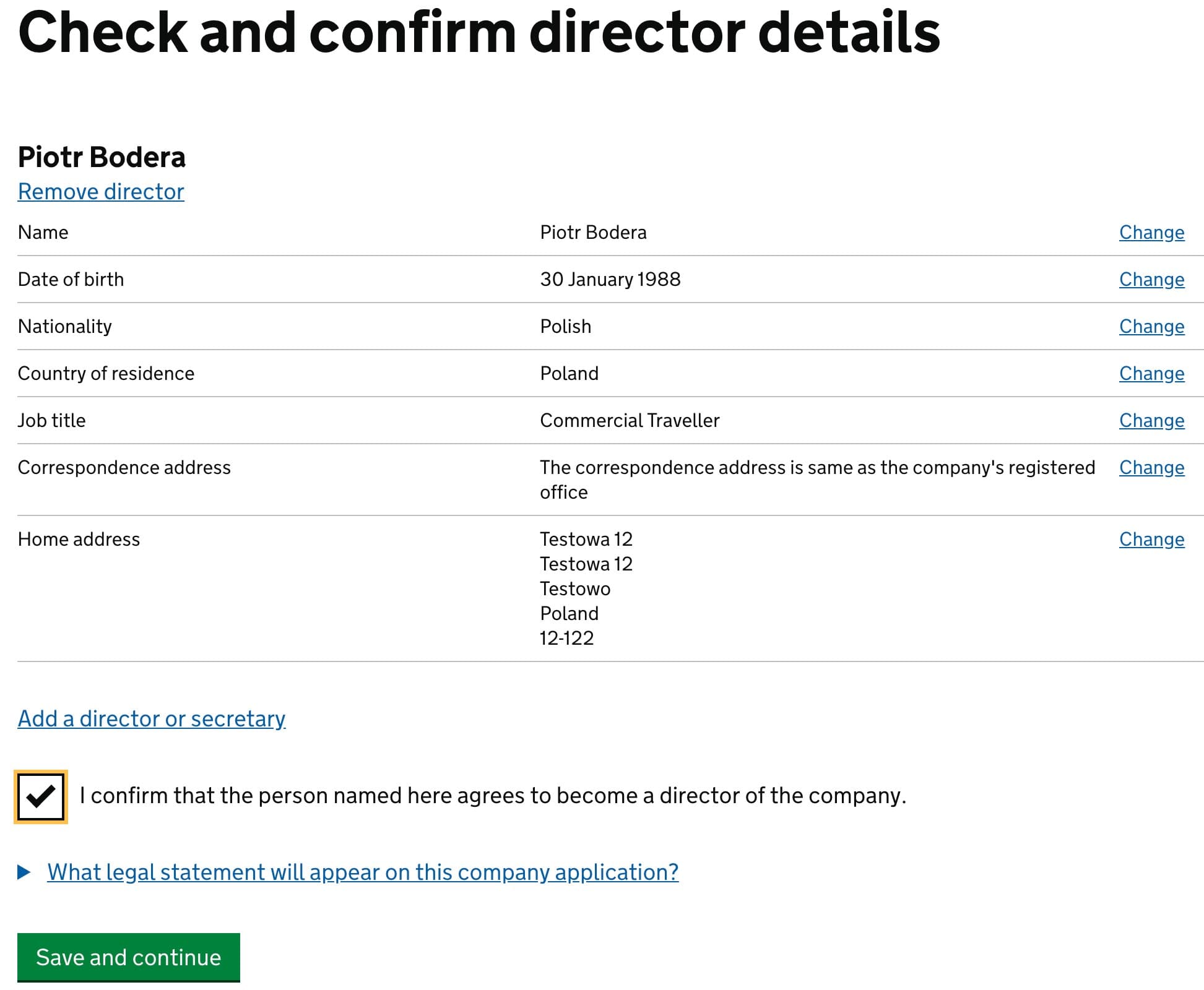 Verify if everything is correct. If so, mark I confirm that the person named here agrees to become a director of the company and click Save and continue.