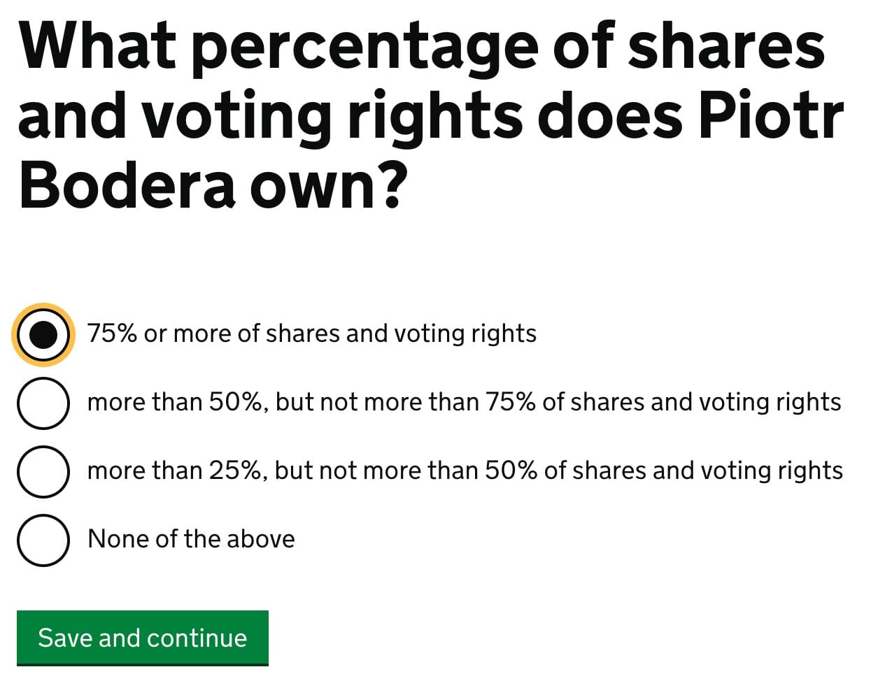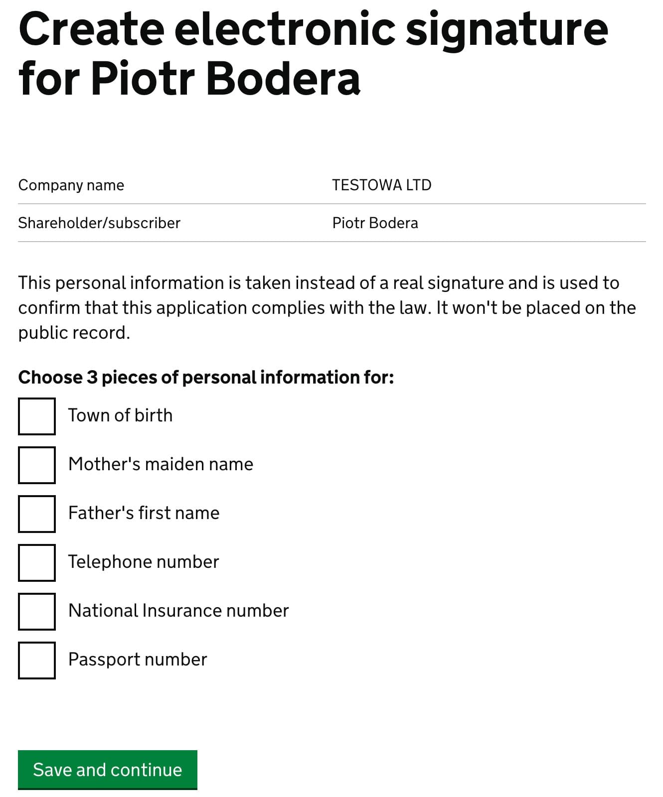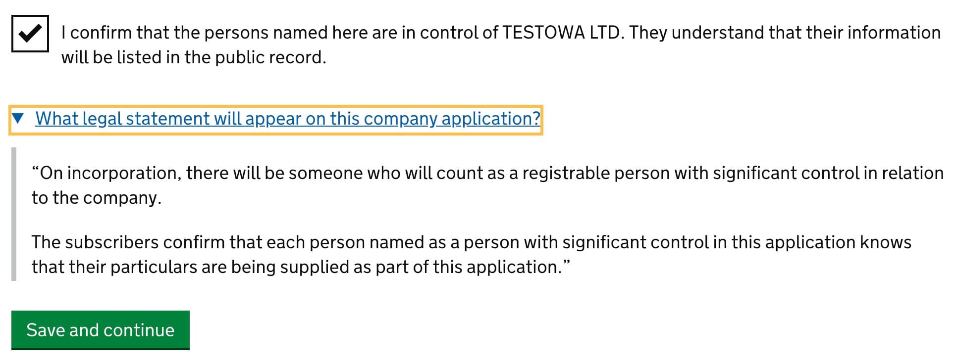 Verify if everything is correct. If so mark I confirm that the persons named here are in control of ___ LTD. They understand that their information will be listed in the public record and click Save and continue.