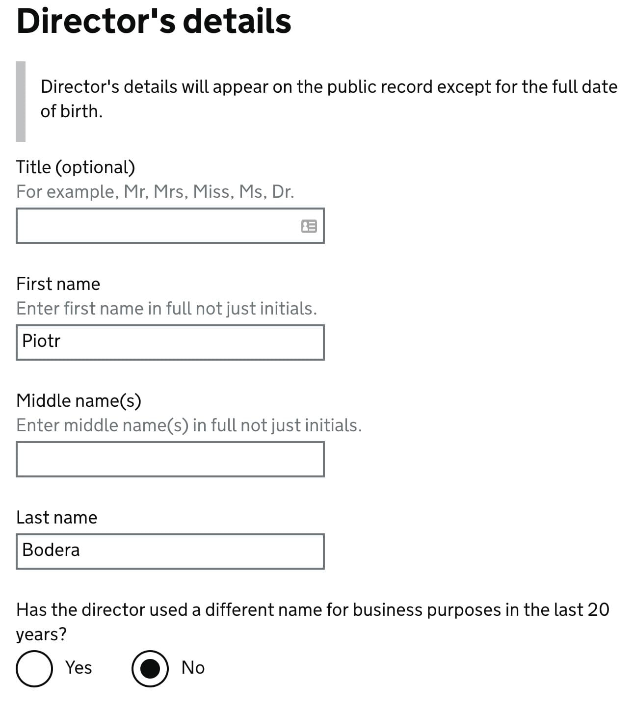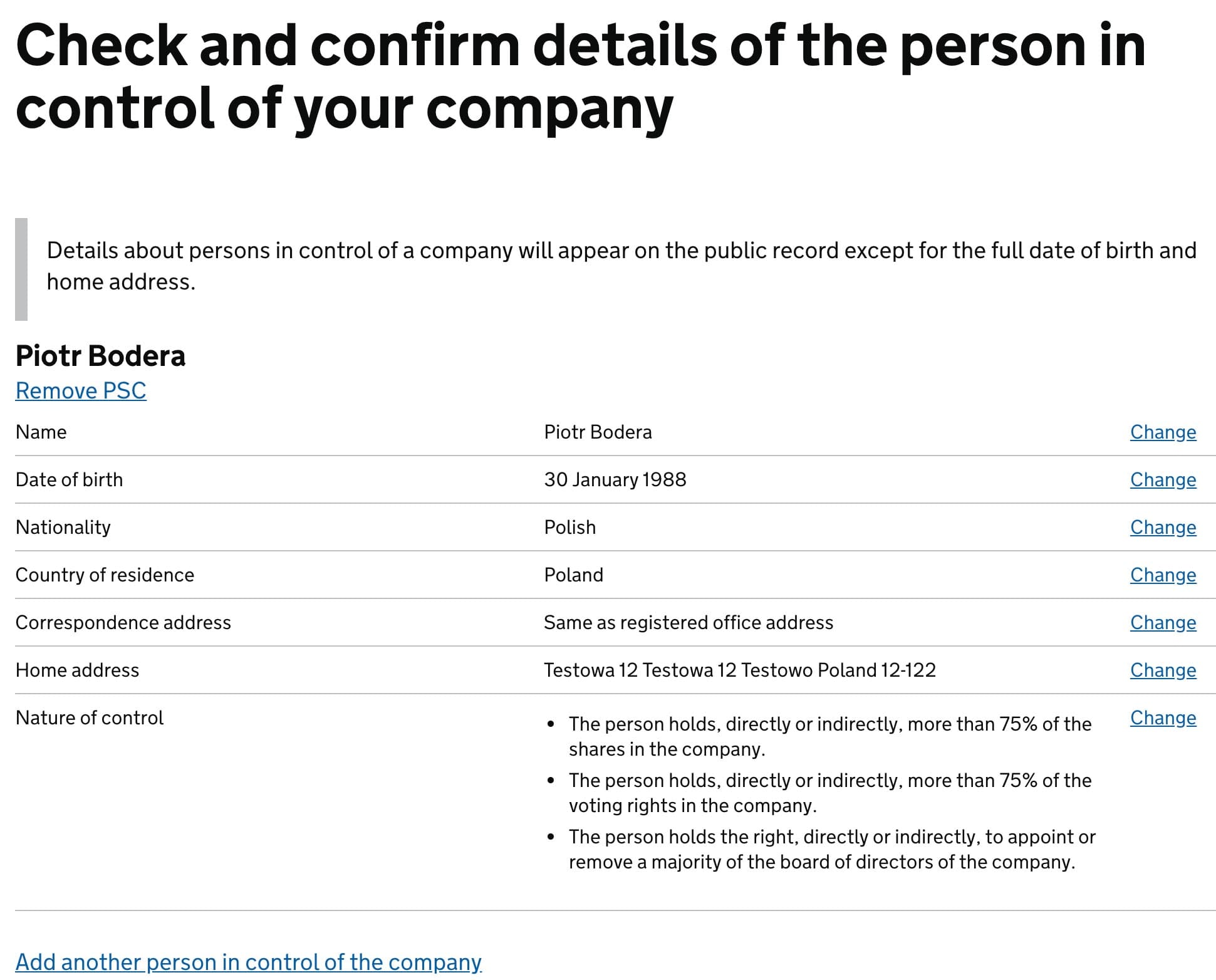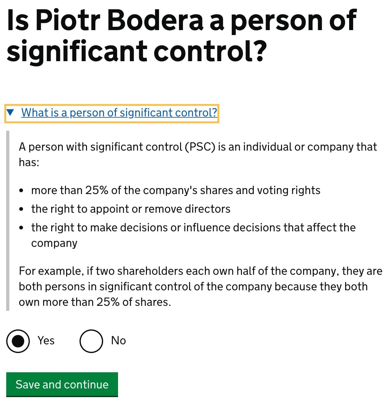 The form will use your details for PSC and ask for confirmation. Mark Yes.