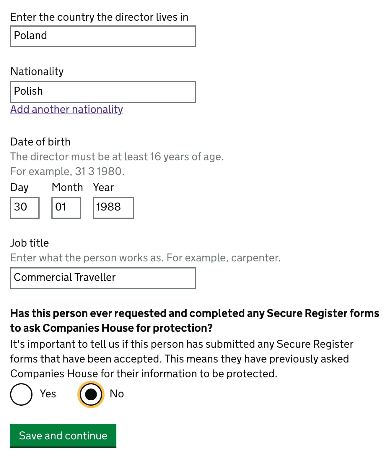 Chose a country where you live and your nationality. Put your date of birth and occupation. Has this person ever requested and completed any Secure Register forms to ask Companies House for protection – applies only to specific situations when you needed to classify your personal data. If not – mark No.