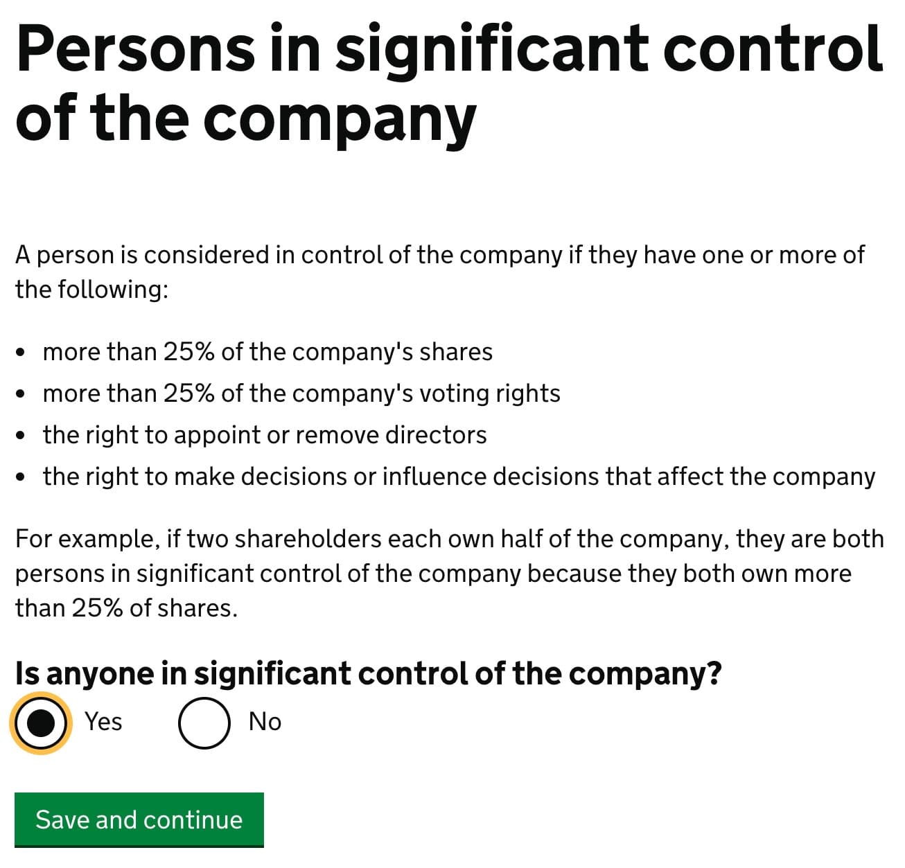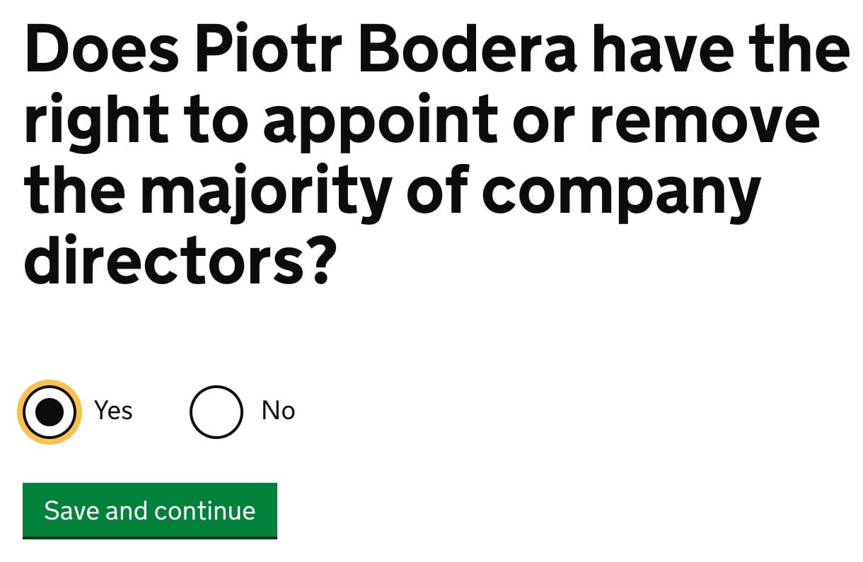 PSC – Persons with Significant Control matters in more complex organisations. In a small business, you are PSC. The following answers are designed for small and one-person companies. Mark Yes.
