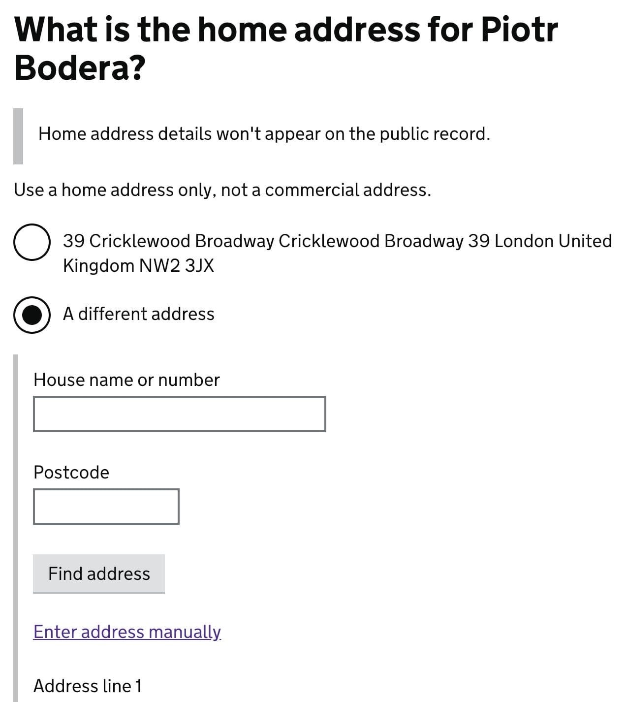 Your home address is not publicly available. If it’s in the UK, try to find it. If not – enter an address manually.