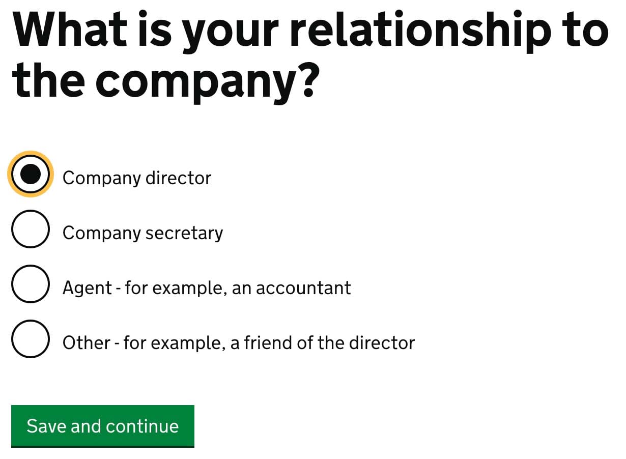 The link confirms your email address. Now mark the Company director. Other roles are reserved for more complex structures. “Company director” is a person in charge that makes key decisions. There’s no limit on how many directors are in LTD but remember about the common sense.