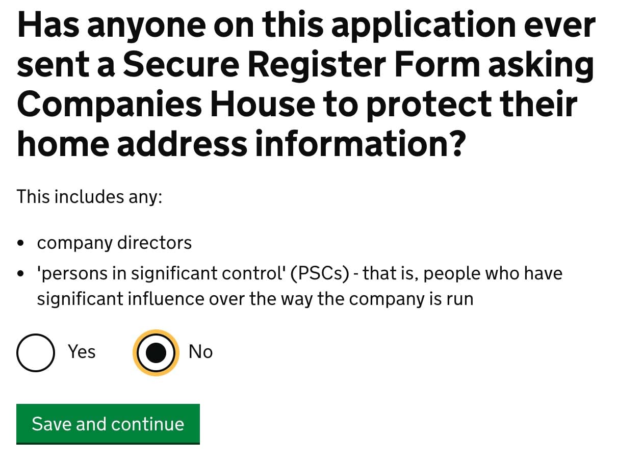 Has anyone on this application ever sent a Secure Register Form asking Companies House to protect their home address information?