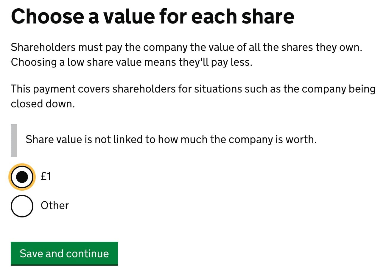 The value of shares is shareholders responsibility, for example, in the case of closing a company. You can choose the suggested 1 GBP.