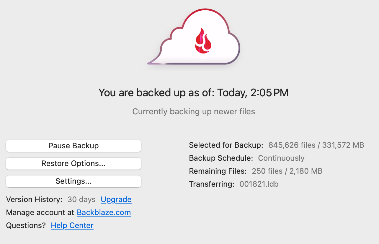 Backblaze Cloud Backup keeps a 30-day version history. Which is completely fine for me. An upgrade extends that to a year or a forever version history. Moreover, Backblaze offers restoration methods that address digital nomad scenarios.