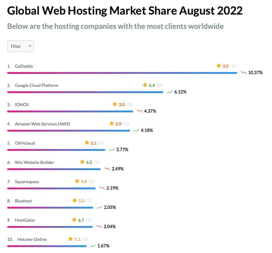 From technical perspective nothing can exist on the Internet without a server. The web hosting industry that provides servers started growing locally in each country in the 1990s. Due to market dynamics, physical vicinity, individuals’ preferences, and niche specialization of each web hosting provider the industry is very decentralized. Even the biggest providers host a small percentage of all the websites available on the Internet. That’s a sign of healthy commercial relationship between providers, website owners, and website users.