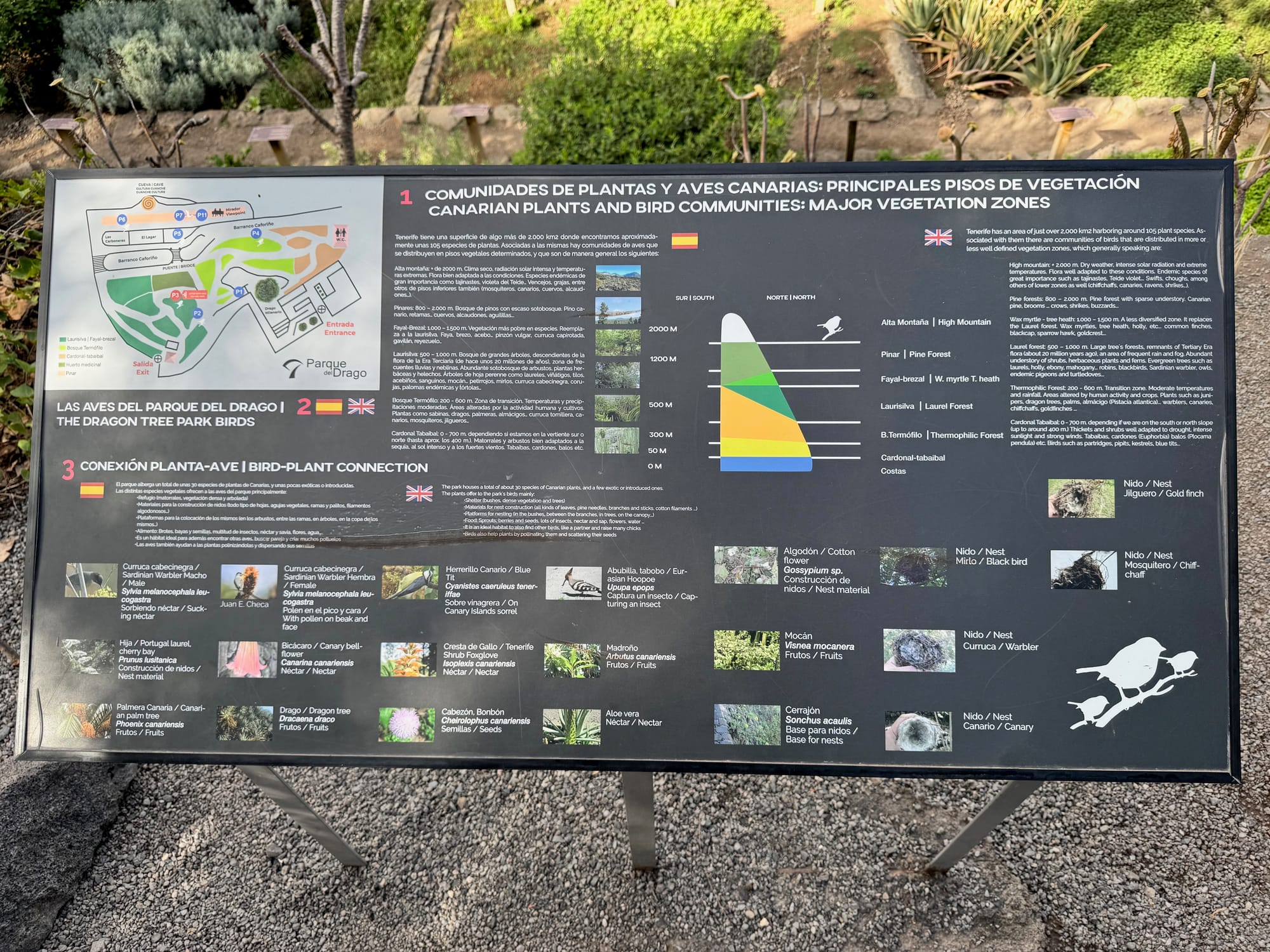 The educational boards written in Spanish and English showcased the variety of life in Tenerife. Visitors can understand how the altitude from sea level to 3,715 meters (12,188 feet) of Mount Teide affects fauna, flora, and fungi. Or which endemic lizard species live on the island.