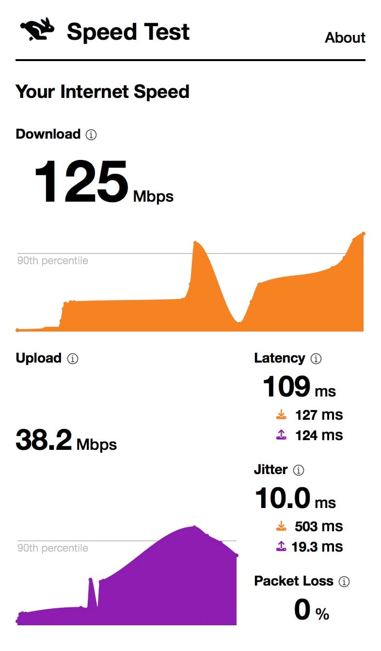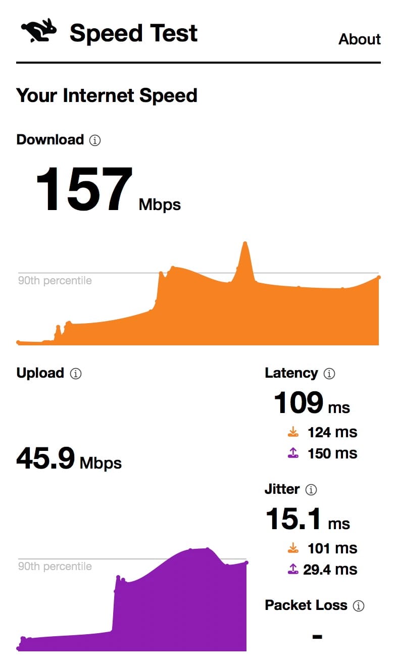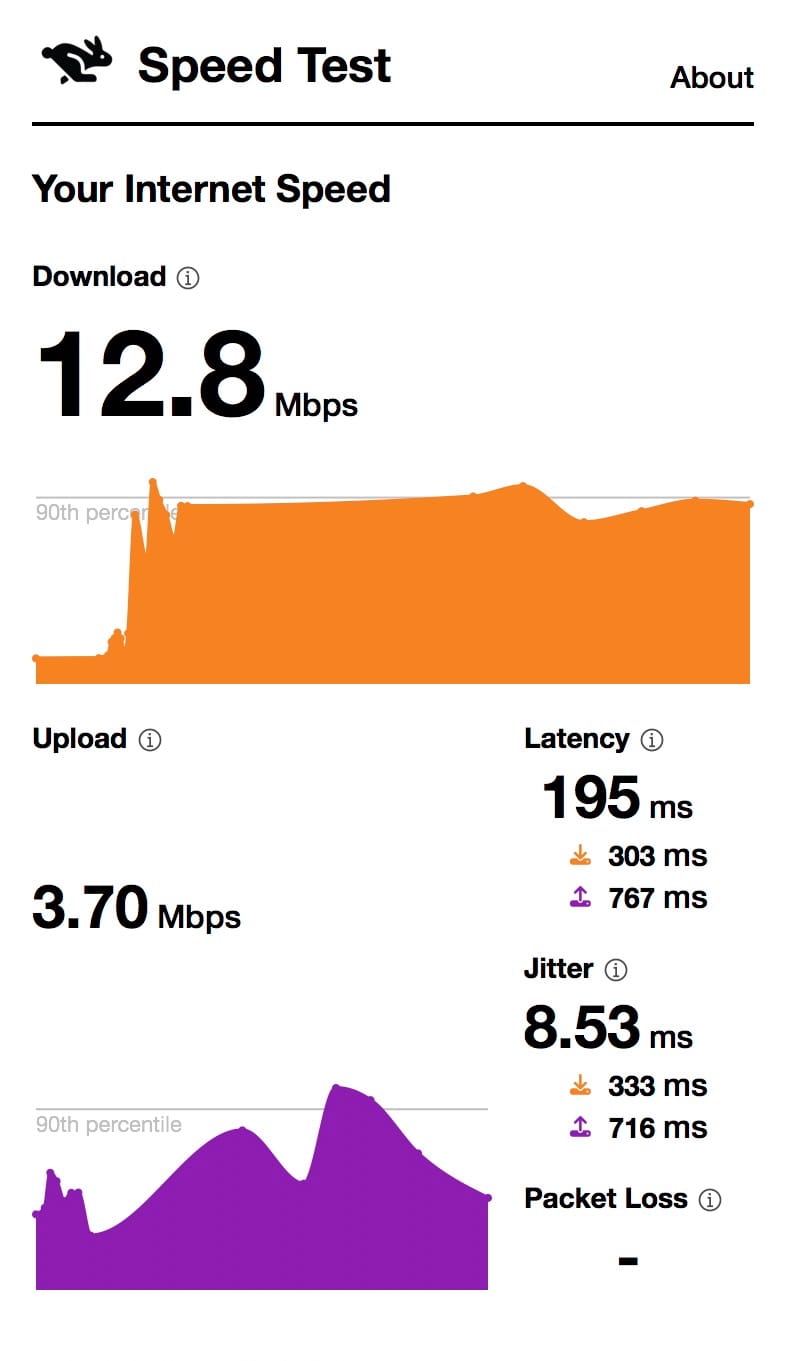 | Hotel Wi-Fi | Off | 12.8 Mbps | 3.7 Mbps | 195 ms |