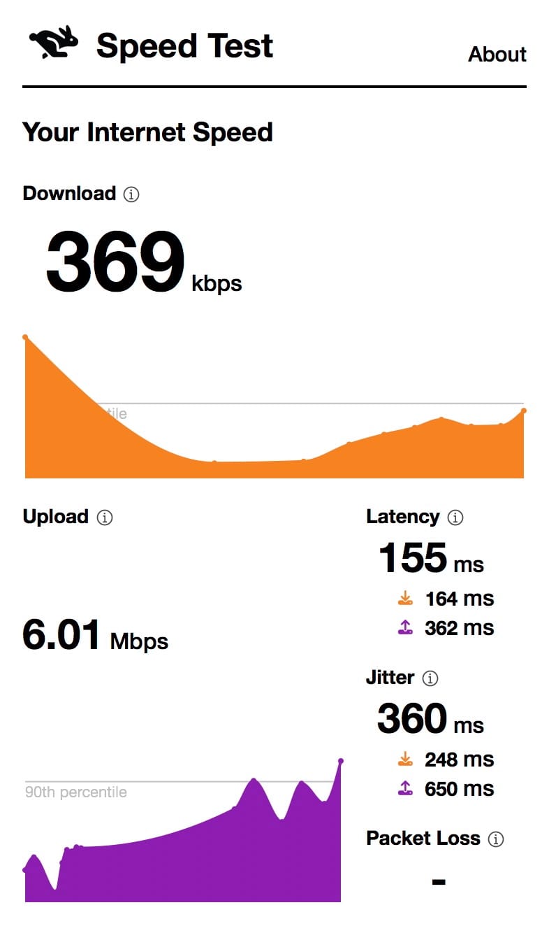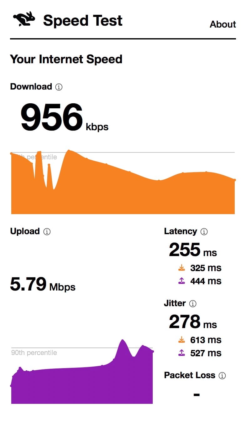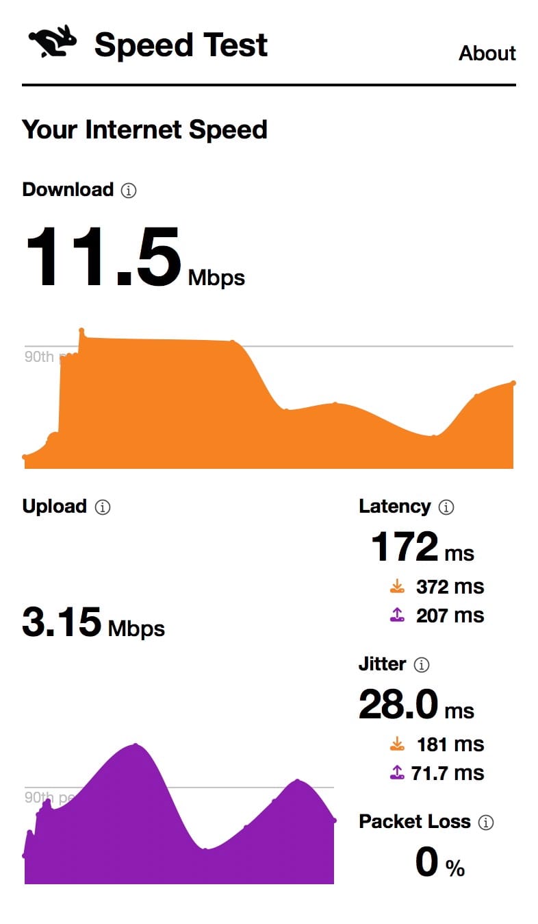 | Hotel Wi-Fi | On | 11.5 Mbps | 3.15 Mbps | 172 ms |