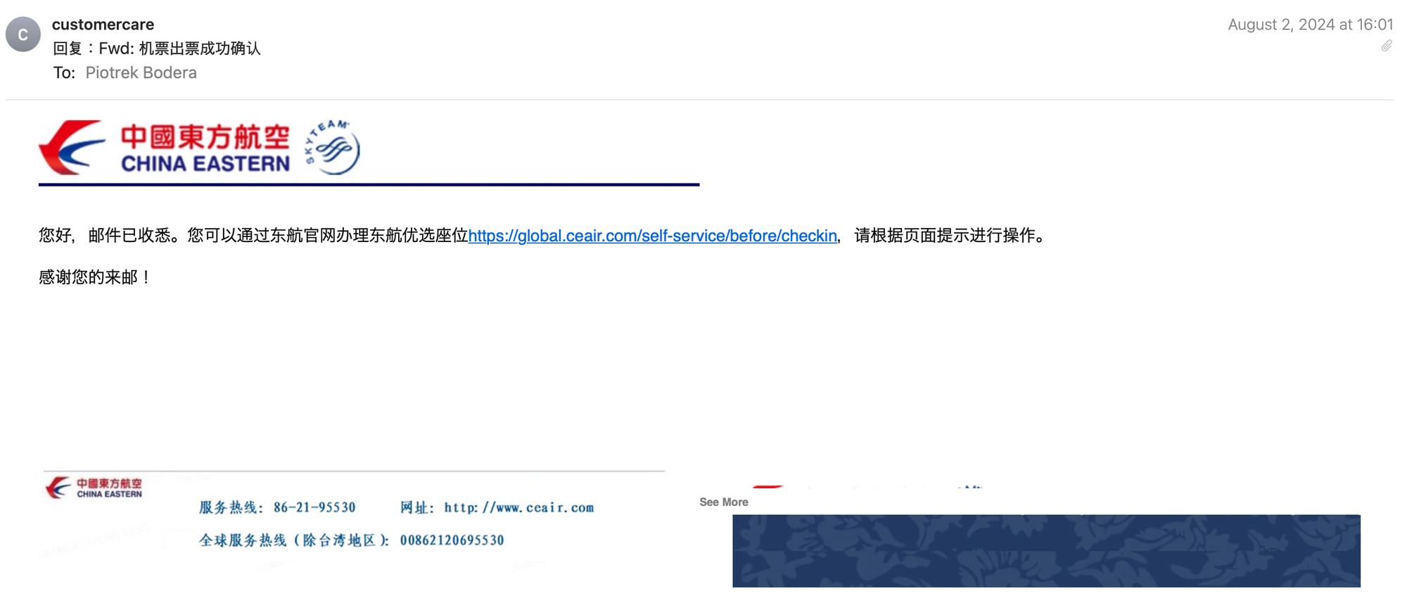 Once I finally managed to buy the ticket, I spent two extra weeks to find the legroom upgrade. Yup! Most airlines try to upsell you services on the spot. With China Eastern, the story was: