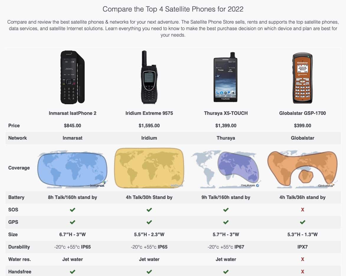 At the time of writing this article, Globalstar’s cheapest plan for satellite phone calls starts at 99.99 USD per month. Internet satellite transmission can easily cost hundreds or thousands of dollars and the coverage, bandwidth and reliability vary a lot depending on the provider, geographic location and use-case.