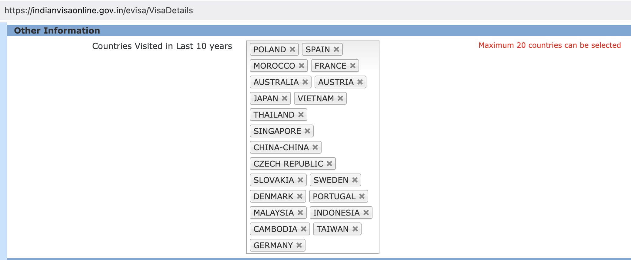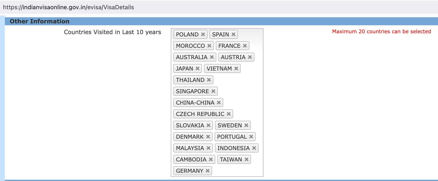 India requires applying for a visa online, and during the process, I encountered a very peculiar bug. They require a list of all countries I visited in the last 10 years. I complied, but discovered that I can't add over 20 positions!