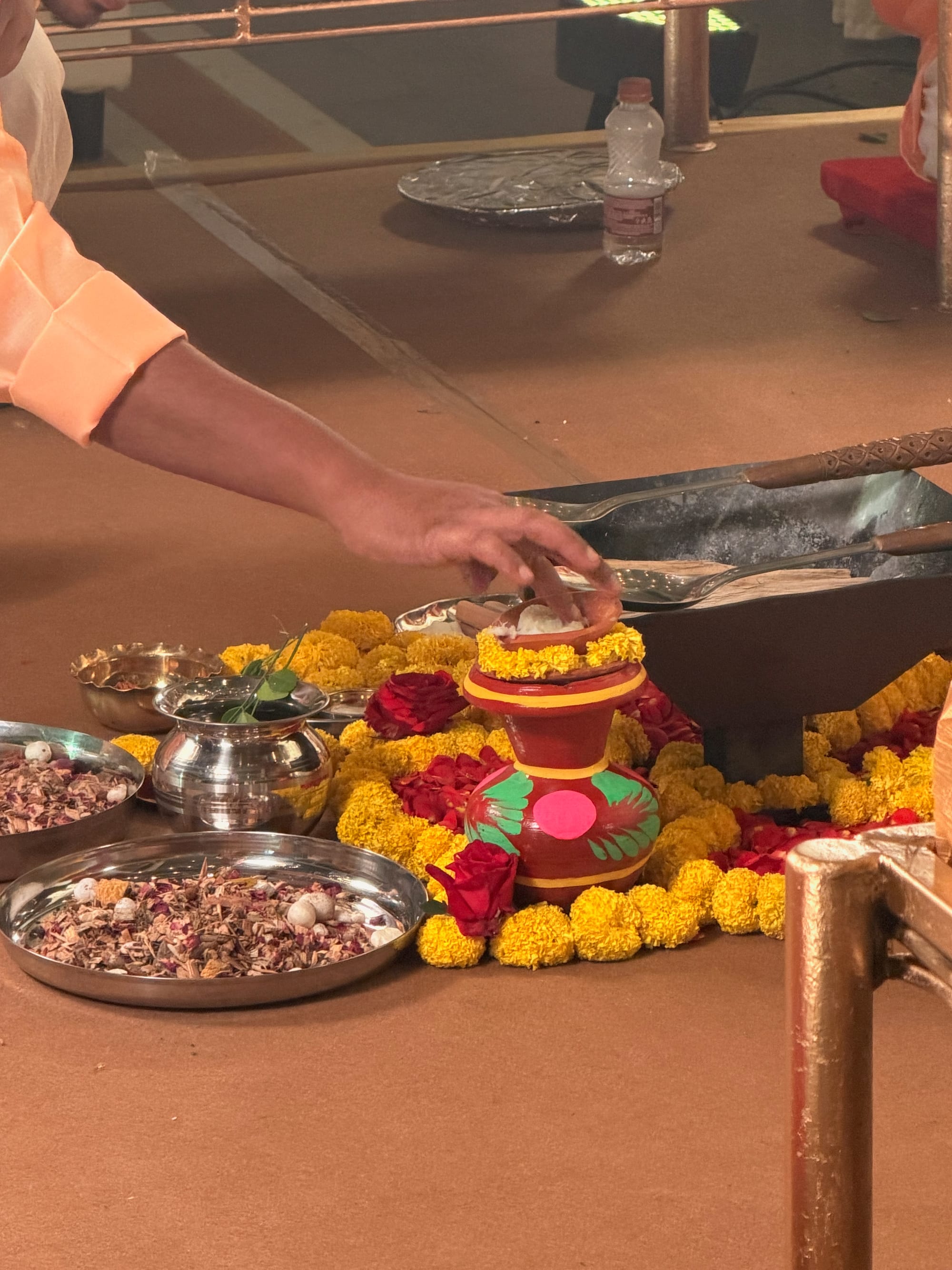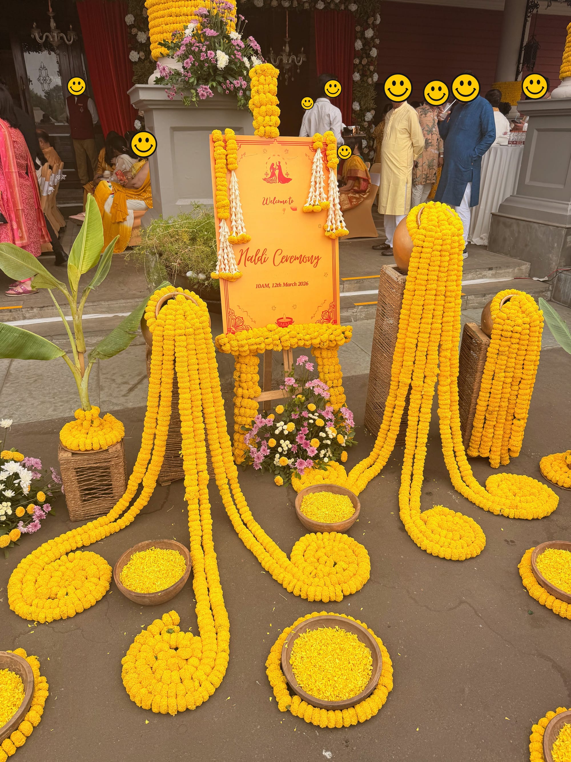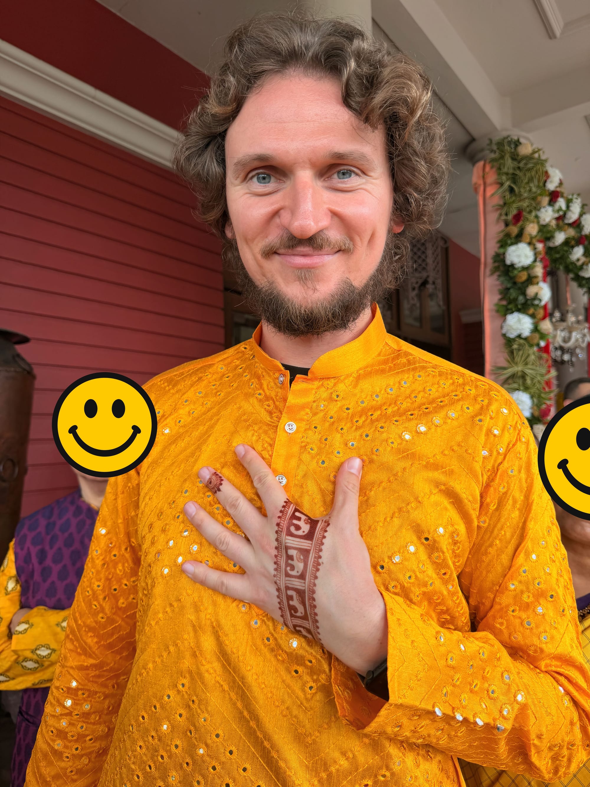 Bright yellow and orange-themed outfits dominated on this occasion. We all gathered outside for the ceremony led by a pandit, a Hindu priest. The bride and groom were sitting on the ground and following the pandit's cues. The ritual involved reciting Sanskrit, purifying with water, and initiating a bonfire. After the slow-paced beginning, the ceremony lived up to the next stage. Traditional marching drummers popped up, and all the guests formed a line to mark the newlyweds with turmeric. Guests drank fresh coconuts, uncles danced, and flower petals rained on the couple.