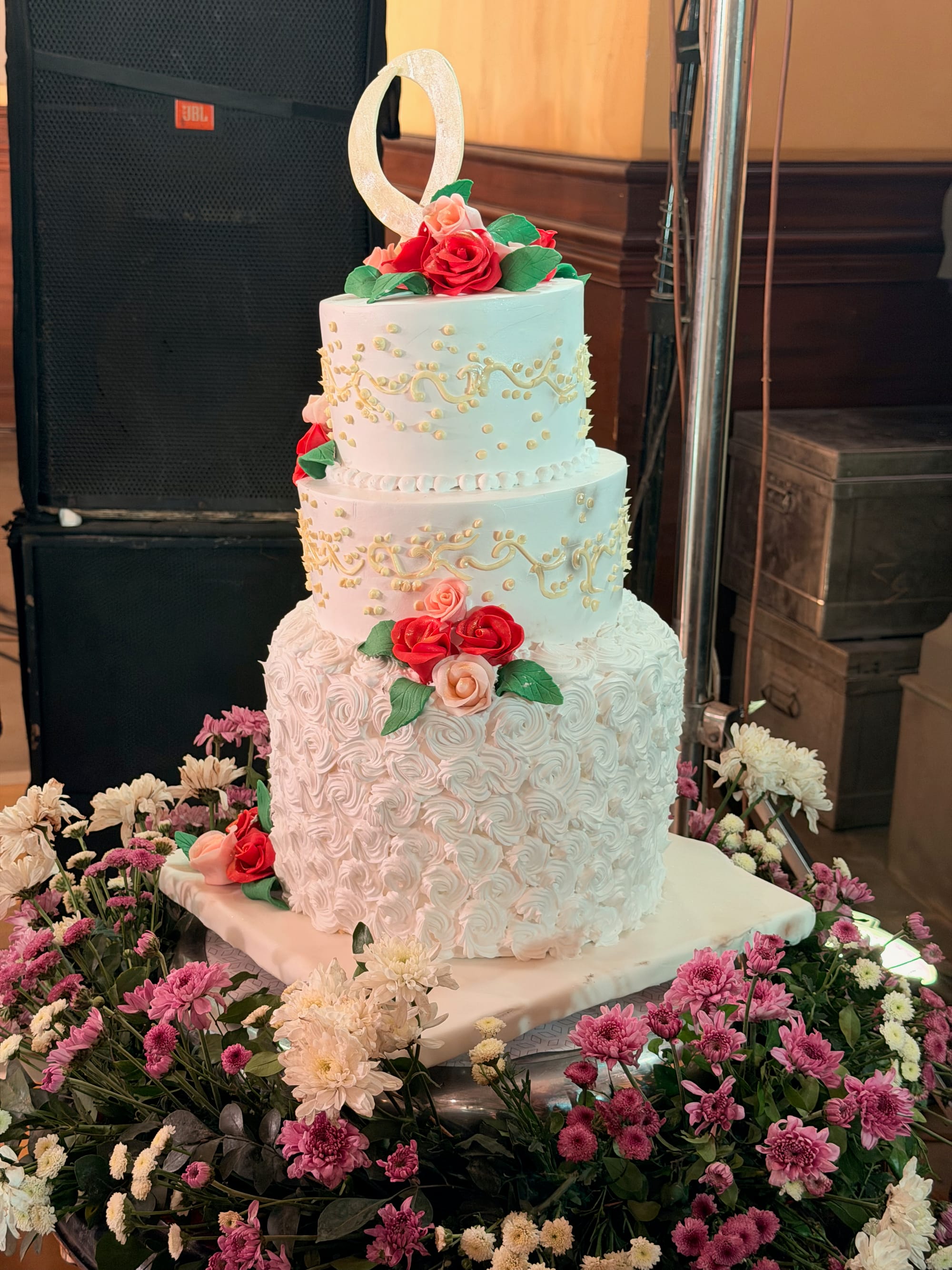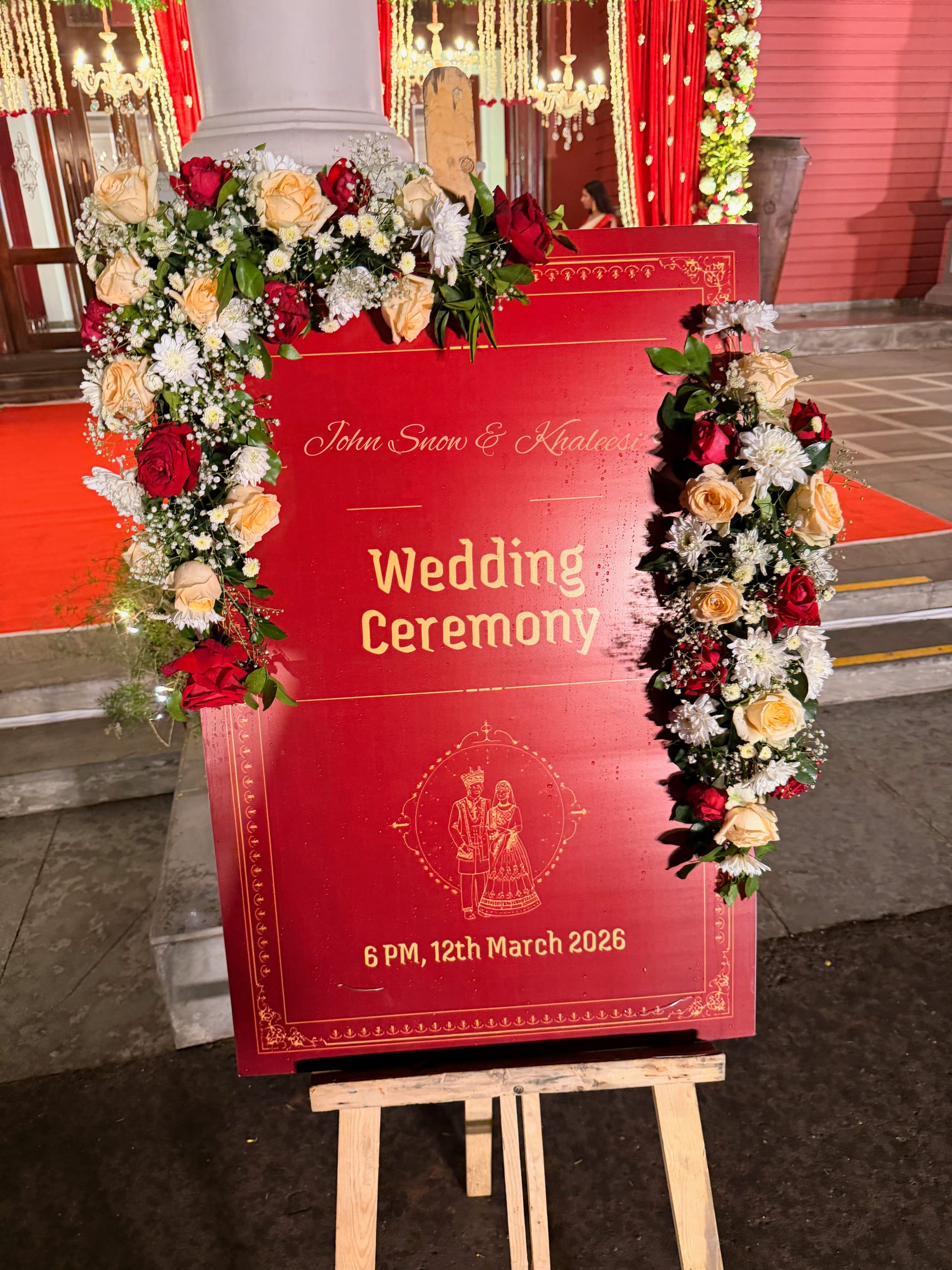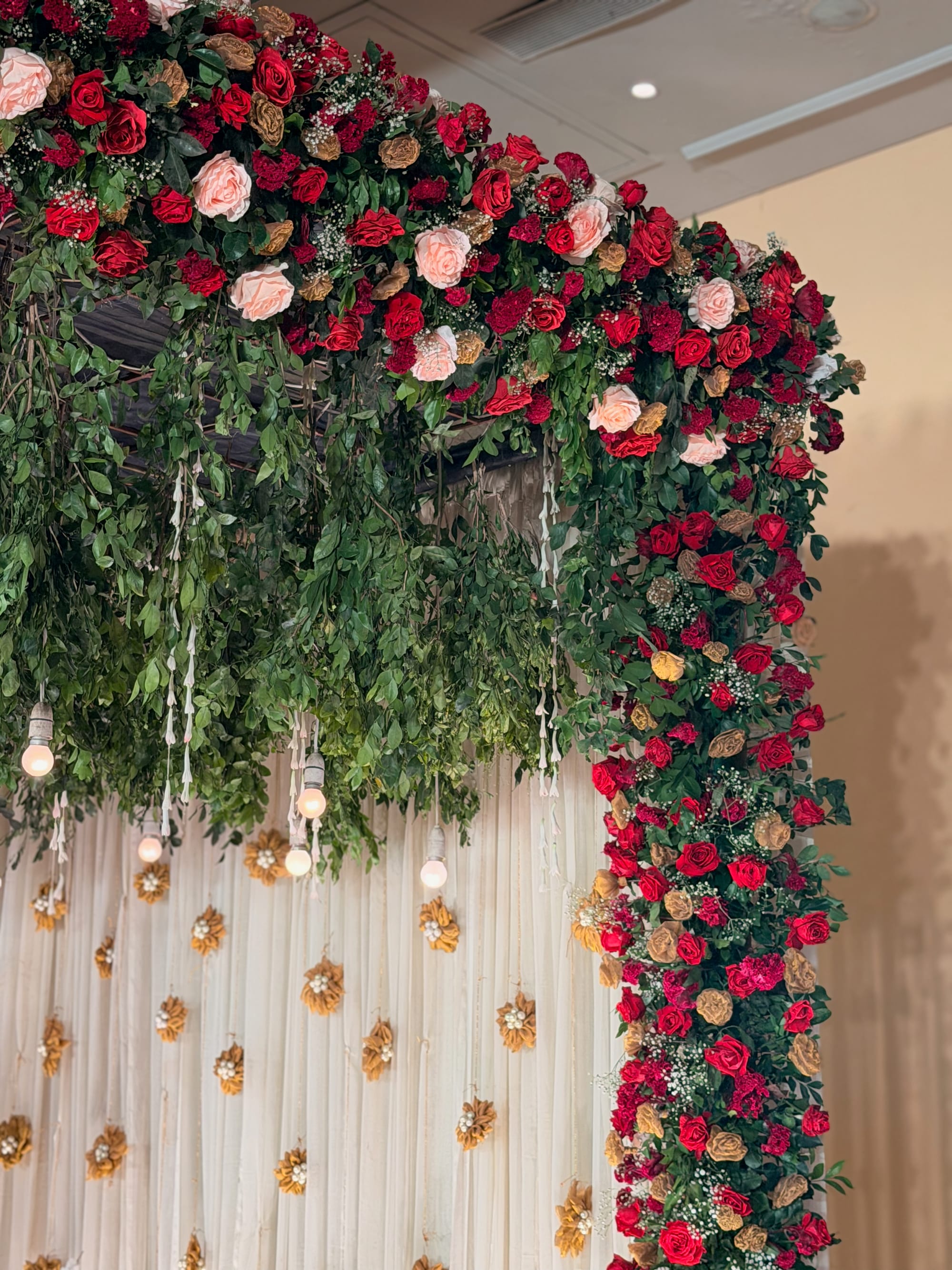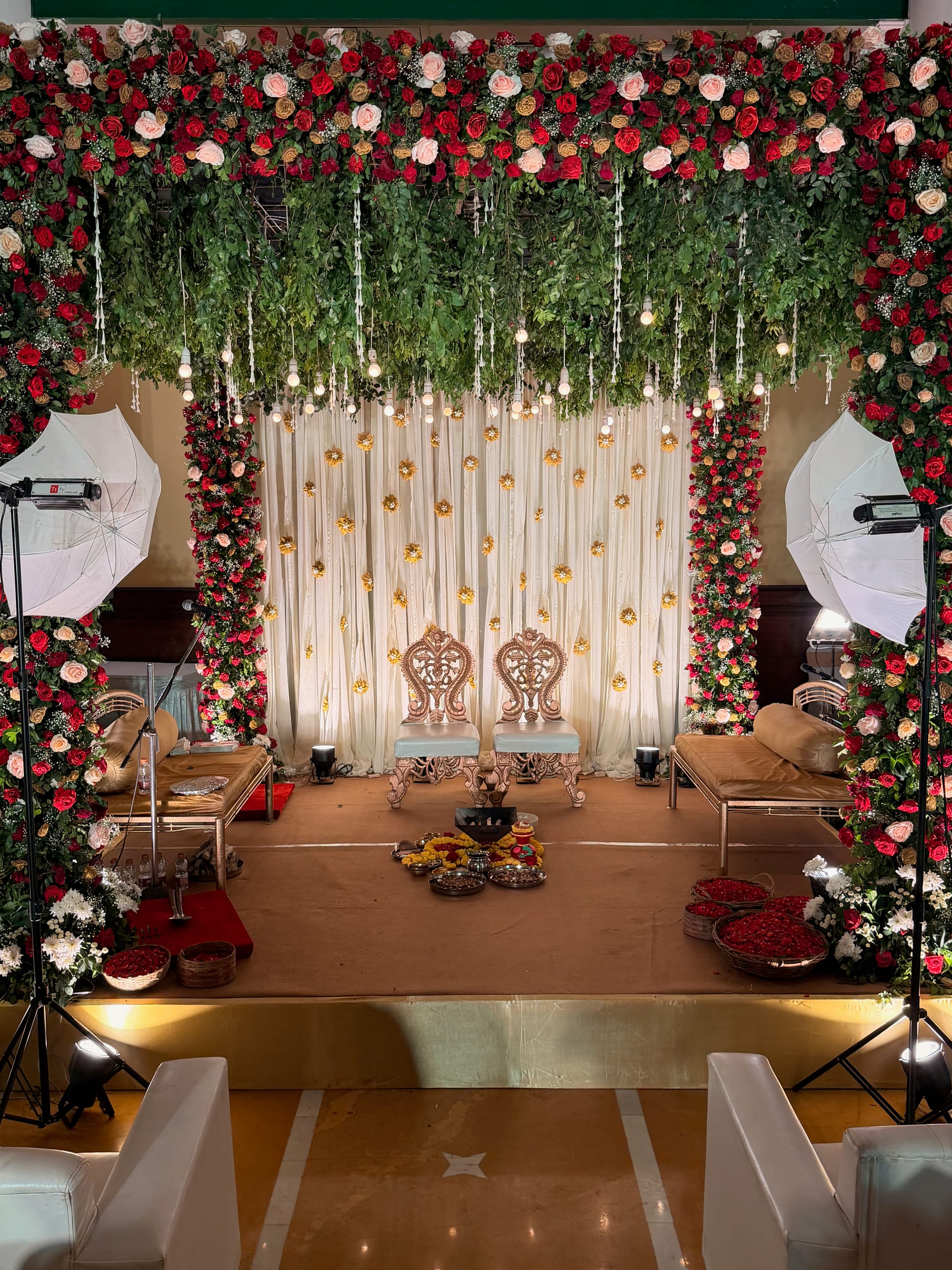 With the final and most official gathering, the three-day celebration came to an end. The hall radiated. Red curtains at the entrance resembled Oscars' red carpet scene. Inside, a smaller stage on the left had a forest-like canopy full of roses, and the main stage featured a fancy sofa with white flowers and chandeliers.