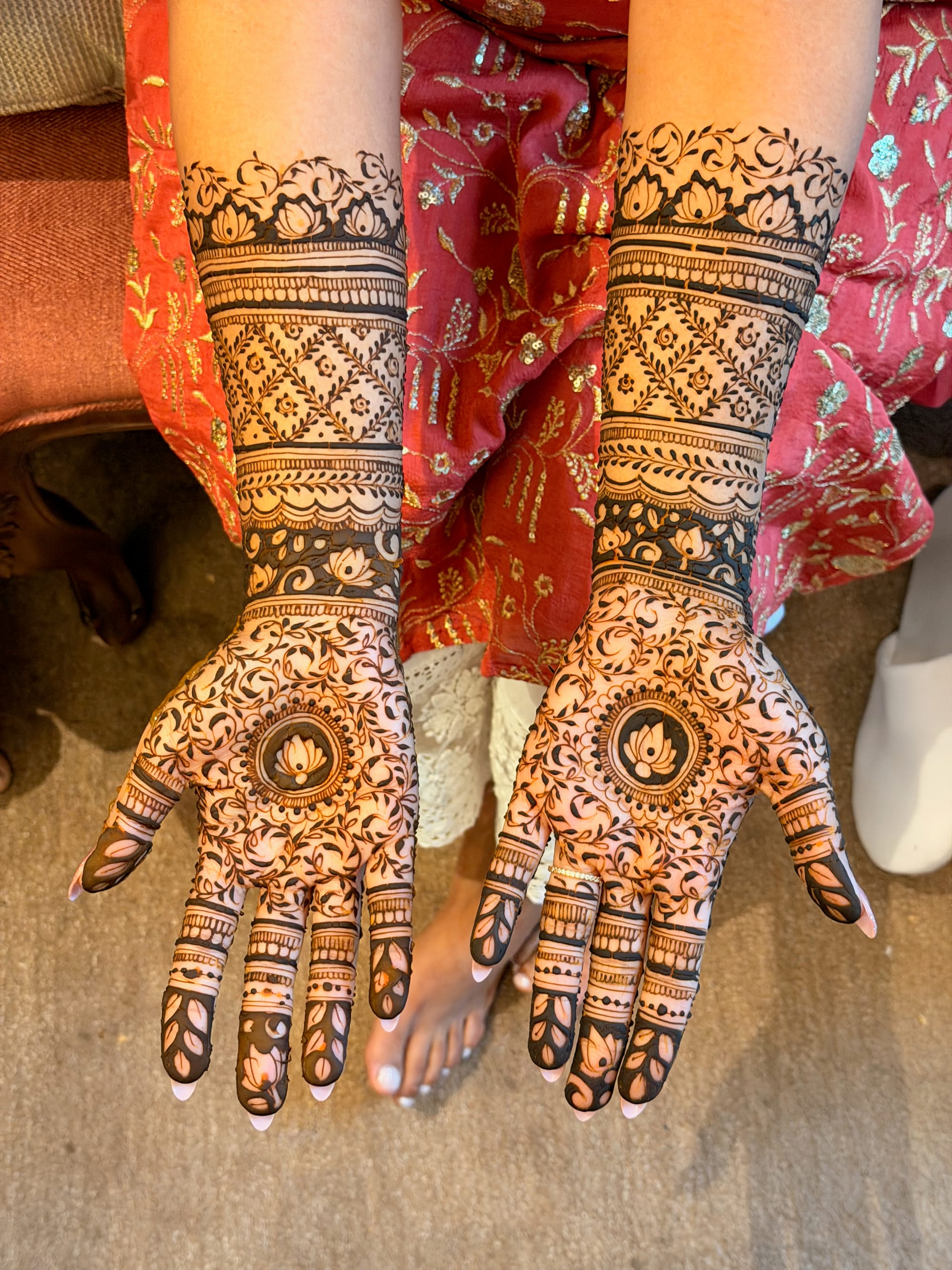 Intricate henna tattoos painted on hands and legs are a signature feature of Indian weddings. I assumed henna tattoos were only for the bride, but in reality, close family and friends receive them too. The henna artists surprised everyone with the precision and diversity of designs. They ranged from complex laces, nature themes, symbols, and in my case, movie film-like frames.