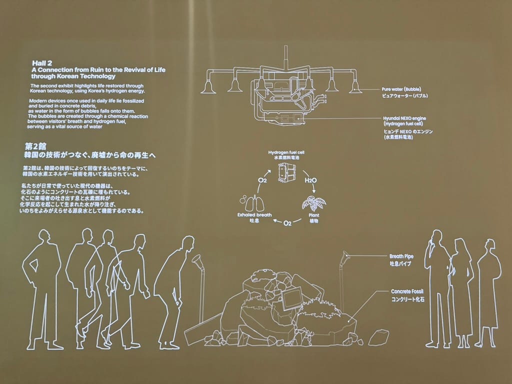 The last room was a cinema with three walls turned into one continuous screen. We sat on the floor and turned our heads left and right to follow a short story about K-pop stars. Obviously, the Korean pavilion had to incorporate this global phenomenon.